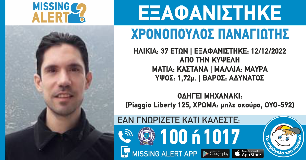 Συναγερμός έχει σημάνει στις Αρχές για τον εντοπισμό του 37χρονου Παναγιώτη Χρονόπουλου, ο οποίος εξαφανίστηκε το μεσημέρι της 12ης Δεκεμβρίου από την Κυψέλη.