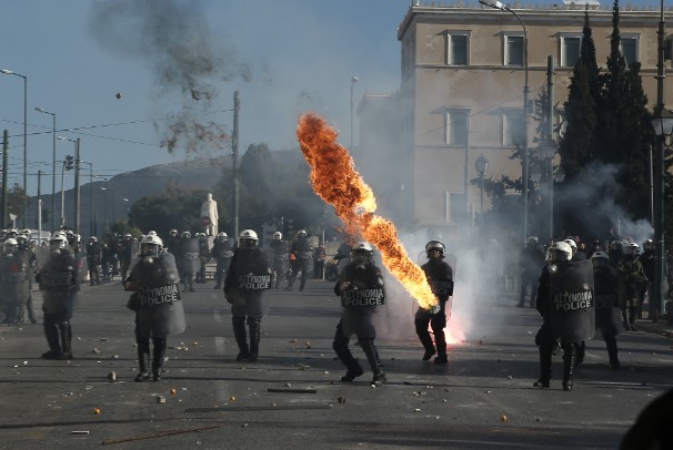 Μάλιστα, έξω από το ξενοδοχείο «Μεγάλη Βρεταννία» οι κουκουλοφόροι επιδόθηκαν σε πετροπόλεμο χωρίς να τους ενοχλήσει κανείς από την αστυνομία, καθώς δύο διμοιρίες των ΜΑΤ ήταν έξω από το Κοινοβούλιο και απλώς παρατηρούσαν την κατάσταση.