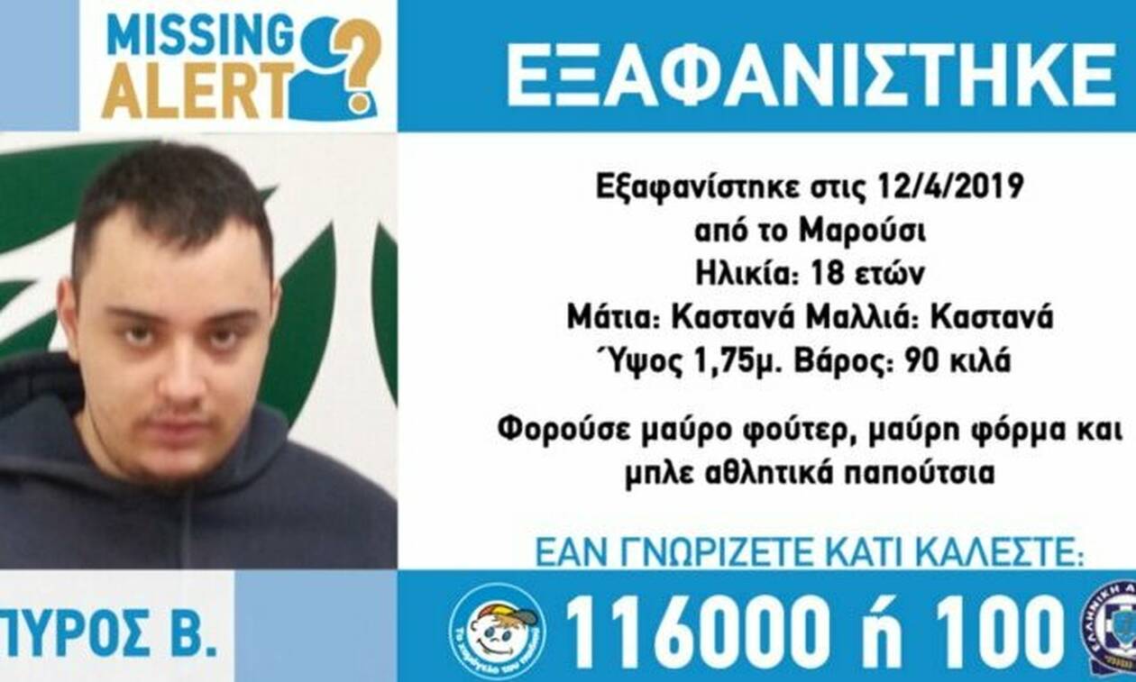 Αναλυτικότερα, στις 12/4/2019, στις 14:00 ώρα, εξαφανίστηκε από το Μαρούσι, ο Σπύρος Β., 18 ετών, όπως αναφέρει σε ενημέρωσή του το Χαμόγελο του Παιδιού.