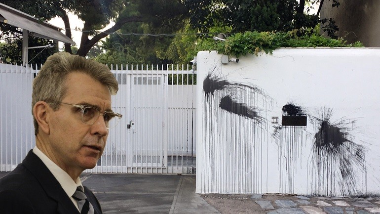Η αναρχική συλλογικότητα «Ρουβίκωνας» ανέλαβε την ευθύνη για την επίθεση με μπογιές που σημειώθηκε τα ξημερώματα της Τετάρτης (15/05/2019) στο σπίτι του Αμερικανού πρέσβη, Τζέφρι Πάιατ