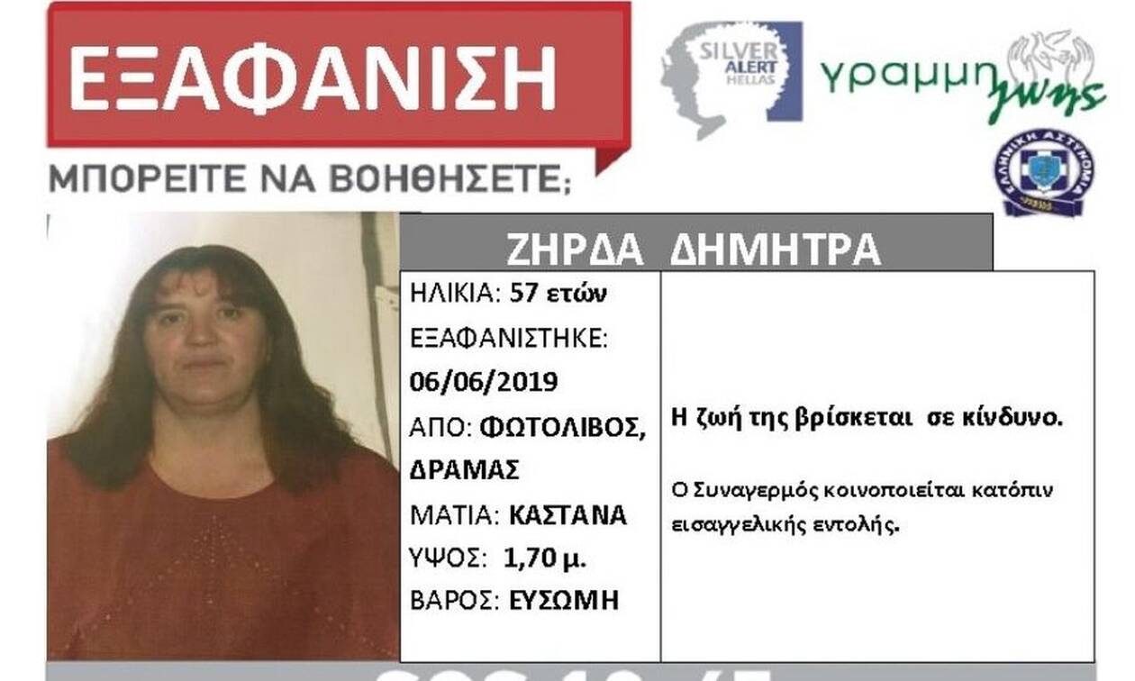 Για την εξαφάνισης 57χρονης από τον Φωτολίβο Δράμας ενημερώνει με ανακοίνωσή της η Γραμμή Ζωής.