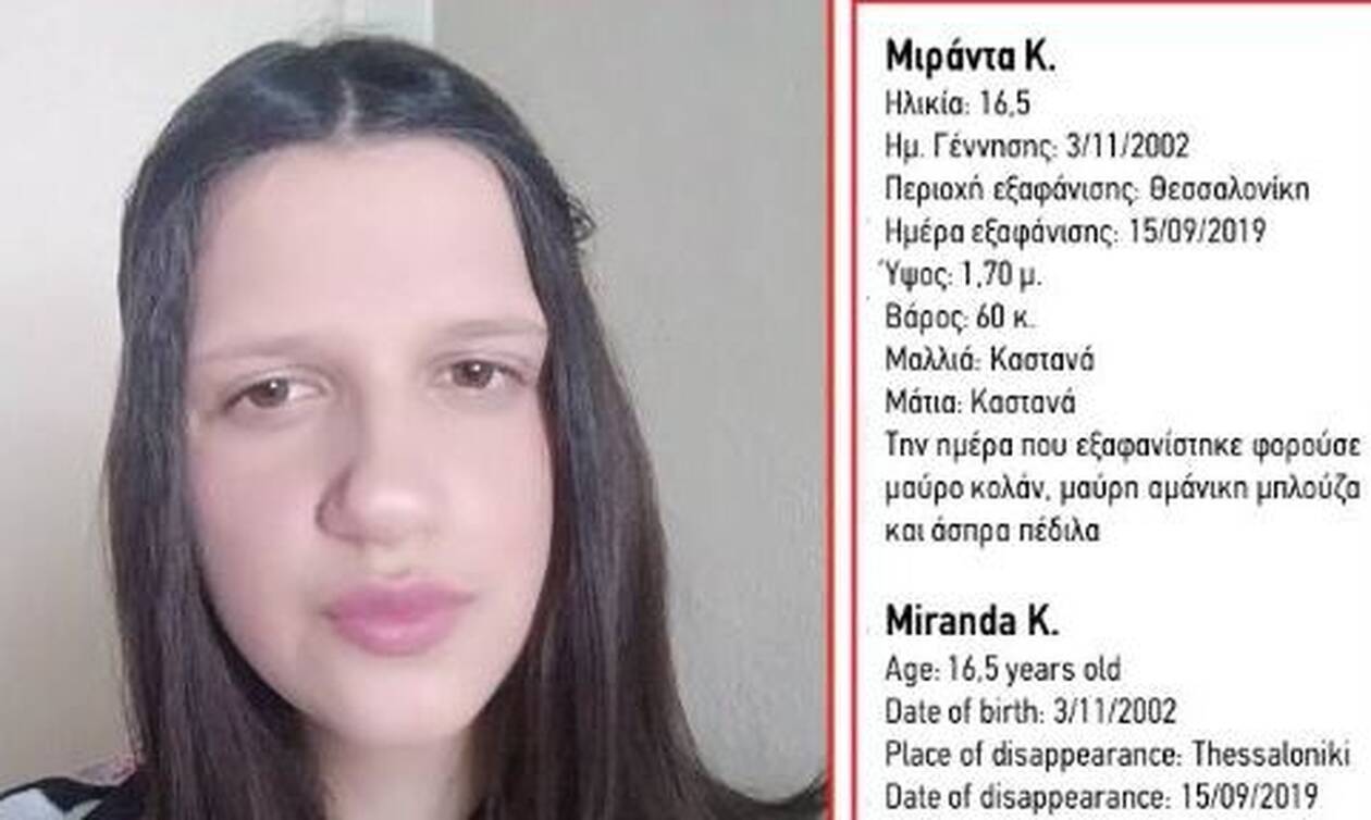 Εξαφανίστηκε από την πόλη της Θεσσαλονίκης την Κυριακή 15 Σεπτεμβρίου, στις 18:00, η Μιράντα Κ., 16,5 ετών. Για την εν λόγω εξαφάνιση, το Χαμόγελο του Παιδιού ενημερώθηκε σήμερα Δευτέρα, κατά τις απογευματινές ώρες, όταν έλαβε τα απαραίτητα στοιχεία του παιδιού.