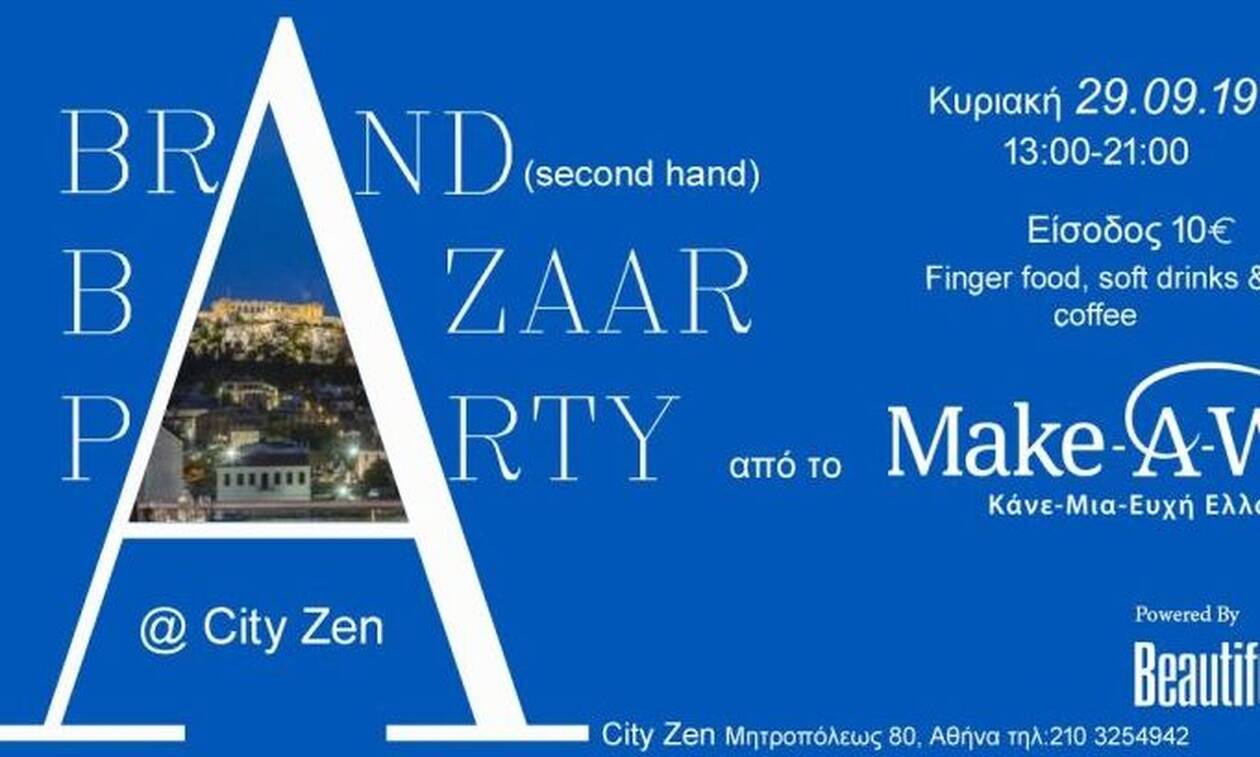 Το Make–A–Wish (Κάνε-Μια-Ευχή Ελλάδος) σας προσκαλεί την Κυριακή 29 Σεπτεμβρίου στο Brand Bazaar Party που διοργανώνει στο City Zen. Πρόκειται για ένα bazaar επώνυμων ειδών με σκοπό την οικονομική ενίσχυση του έργου του οργανισμού.