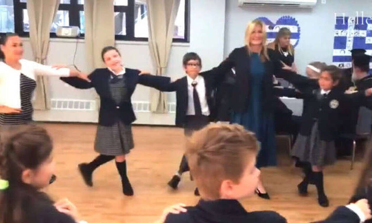 Η σύζυγος του πρωθυπουργού που συνομίλησε με τους μικρούς μαθητές χόρεψε μαζί τους και ελληνικούς χορούς.
