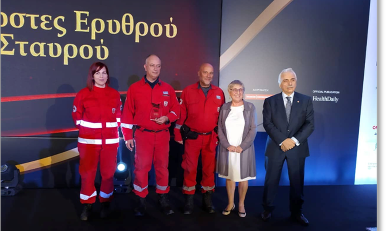 Ο Πρόεδρος του Ελληνικού Ερυθρού Σταυρού, Dr. Αντώνιος Αυγερινός με κλιμάκιο Εθελοντών Σαμαρειτών ανέβηκαν στο βήμα για να παραλάβουν αυτό το ξεχωριστό βραβείο.