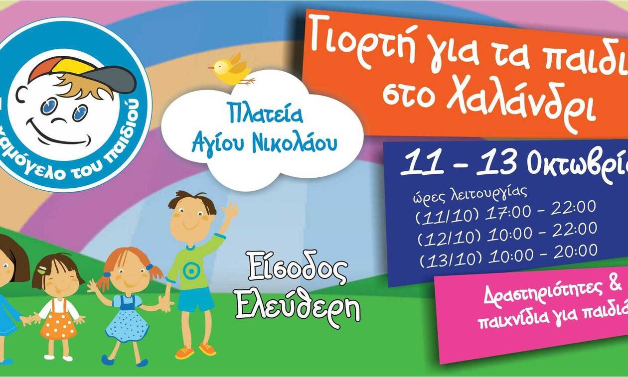 «Το Χαμόγελο του Παιδιού» σας προσκαλεί στην Γιορτή για τα παιδιά στην πλατεία Αγίου Νικολάου στο Χαλάνδρι, από τις 11 έως τις 13 Οκτωβρίου με την υποστήριξη του Δήμου Χαλανδρίου και ελεύθερη είσοδο. Ώρες λειτουργίας: Παρασκευή από τις 17:00 έως τις 22:00, Σάββατο από τις 10:00 έως τις 22:00 και Κυριακή από τις 10:00 έως τις 20:00.