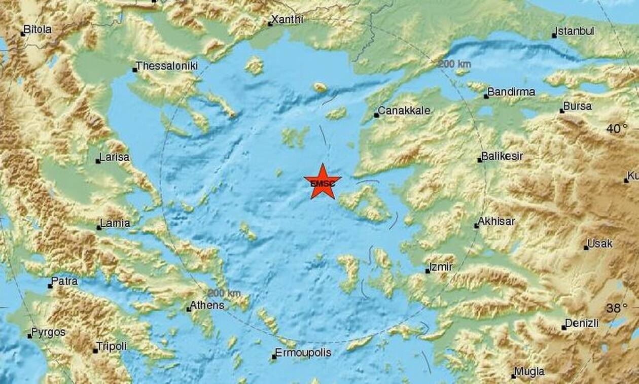Το ακριβές επίκεντρο της δόνησης εντοπίζεται, 56χλμ. δυτικά της πόλης της Μυτιλήνης.