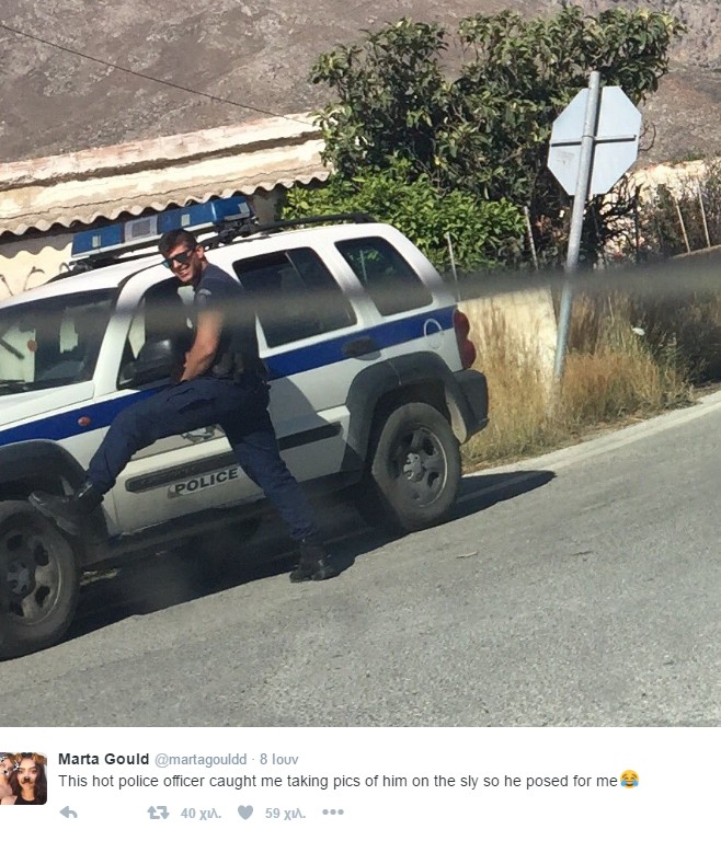 Η νεαρή Mάρτα είδε έναν νεαρό αστυνομικό και ξεκίνησε να τραβάει φωτογραφίες. Όταν ο νεαρός αστυνομικός αντιλήφθηκε ότι ήταν ο… πρωταγωνιστής στα καρέ της νεαρής κοπέλας, άρχισε να ποζάρει με αποτέλεσμα όταν ανέβασε τις φωτογραφίες η Μάρτα στο twitter να γίνει ο κακός χαμός από like και retweet.