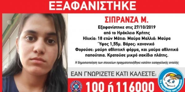 “Στις 27/10/2019 και ώρα 18:00, εξαφανίστηκε από την περιοχή του Ηρακλείου Κρήτης, η Σιπράνζα Μ., 18 ετών”, αναφέρει το Χαμόγελο του Παιδιού σε ανακοίνωσή του.