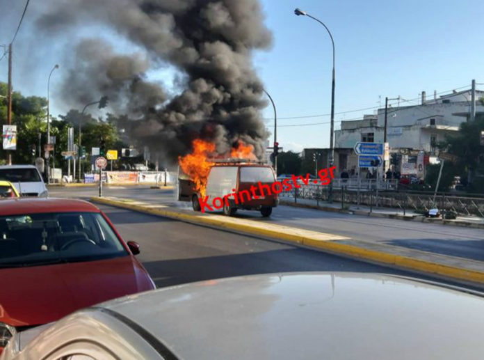 Στις φλόγες τυλίχθηκε ΙΧ φορτηγάκι ενώ βρισκόταν εν κινήσει στα φανάρια του Κιάτου την παλαιά εθνική oδό Κορίνθου – Πατρών.