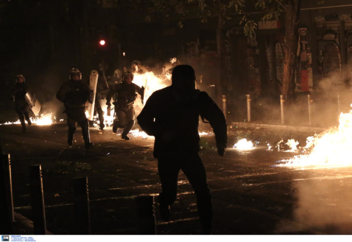 Οι αντιεξουσιαστές πέταξαν μολότοφ στους άνδρες των ΜΑΤ στα Εξάρχεια και ακολούθησε καταδίωξη και χρήση χειροβομβίδων κρότου-λάμψης και χημικών.