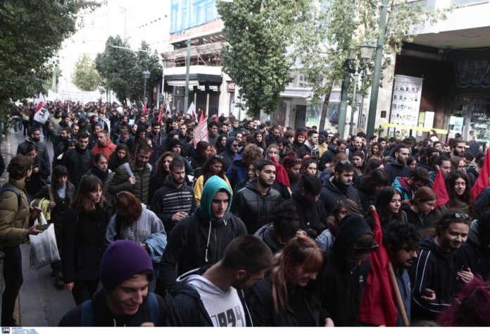Συλλαλητήριο πραγματοποιούν μαθητές και φοιτητές στα Προπύλαια διαμαρτυρόμενοι για το νομοσχέδιο που προωθεί η κυβέρνηση για την παιδεία.