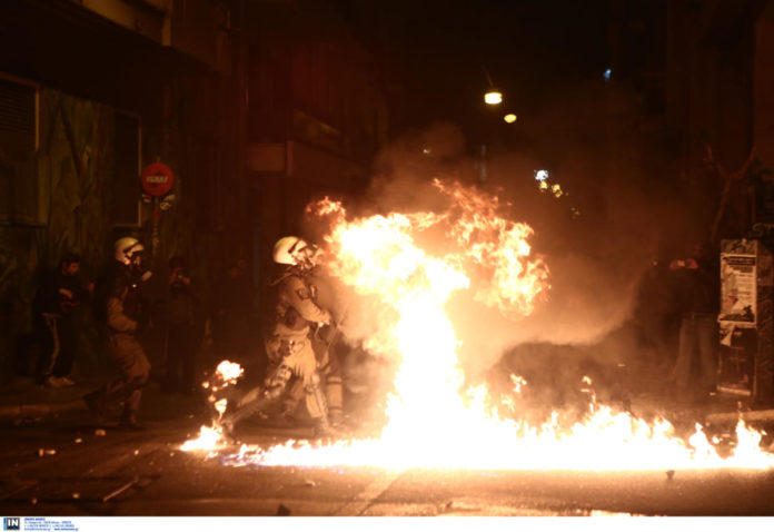 Στα Εξάρχεια τα επεισόδια ξεκίνησαν με τους γνωστούς – άγνωστους να ρίχνουν μολότοφ προς τις αστυνομικές δυνάμεις. Πέτρες και κάθε είδους αντικείμενα εκσφενδονίζονταν προς τους αστυνομικούς, οι οποίοι τηρούσαν “αμυντική” στάση και έκαναν χρήση χημικών ανά τακτά χρονικά διαστήματα ώστε να “απωθούν” τους αντιεξουσιαστές.