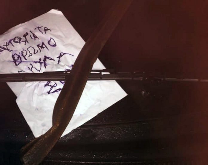 Πρόκειται για ένα απίστευτο αλλά δυστυχώς αληθινό συμβάν που έλαβε χώρα αυτές τις μέρες στην Άρτα. Μια γυναίκα, γιατρός του Γενικού Νοσοκομείου Άρτας, φιλόζωη, η οποία φροντίζει και περιθάλπει τα αδέσποτα ζώα εκεί, πηγαίνοντας να πάρει το αυτοκίνητό της στο πάρκινγκ του νοσοκομείου, βρήκε στο παρμπρίζ απειλητικό σημείωμα, το οποίο συνοδευόταν από έναν σιδηρολοστό τοποθετημένο κατά μήκος του, όπως βλέπετε στην πιο κάτω φωτογραφία.