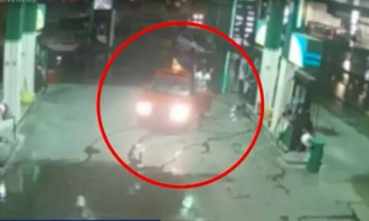 Στο βίντεο που μετέδωσε το Mega, φαίνεται η στιγμή που οι δύο άντρες μαζί με την κοπέλα σταματούν σε ένα βενζινάδικο.