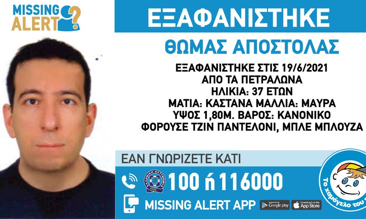 Στις 19 Ιουνίου 2021 εξαφανίστηκε από την περιοχή Πετράλωνα, ο Αποστολάς Θωμάς, 37 ετών