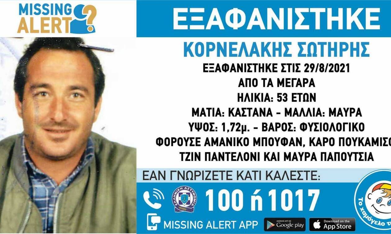 Σημειώνεται ότι τα ίχνη του 53χρονου έχουν χαθεί από τα τέλη του περασμένου Αυγούστου, ωστόσο, μόλις τη Δευτέρα (25.10.2021) ενημερώθηκε το «Χαμόγελο του Παιδιού» για την εξαφάνιση του 53χρονου Σωτήρη Κορνελάκη από την περιοχή της Νέας Περάμου στα Μέγαρα, στις 29.08.2021.