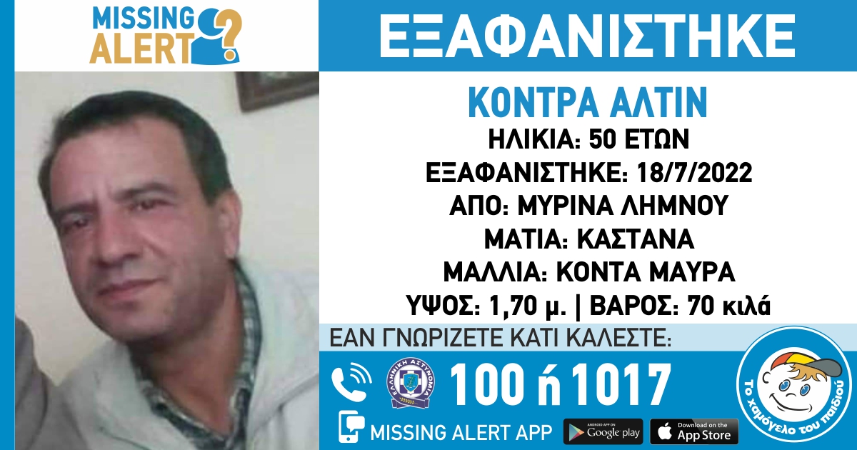 Στις 18/07/2022, εξαφανίστηκε από την περιοχή της Μύρινας Λήμνου, ένας 50χρονος ο Κόντρα Αλτίν. Το «Χαμόγελο του Παιδιού» ενημερώθηκε, για την εξαφάνιση του Κόντρα και προχώρησε σήμερα 31/10/2022 στη δημοσιοποίηση των στοιχείων του ενήλικα κατόπιν αιτήματος της οικογένειας του, καθώς ενδέχεται να συντρέχουν λόγοι οι οποίοι θέτουν τη ζωή του σε κίνδυνο.