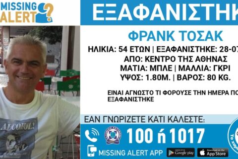 Στις 28 Ιουλίου 2023, εξαφανίστηκε από το κέντρο της Αθήνας ο Φρανκ (ον.) Τοσάκ (επ.), 54...