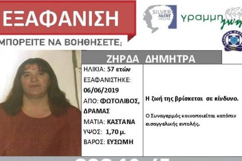 Για την εξαφάνισης 57χρονης από τον Φωτολίβο Δράμας ενημερώνει με ανακοίνωσή της η Γραμμή Ζωής.Η 57χρονη...