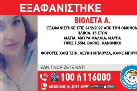 Στις 24.02.2022, εξαφανίστηκε από την περιοχή της Ομόνοιας, η Βιολέτα Α. 15 ετών, βουλγαρικής καταγωγής «Το...