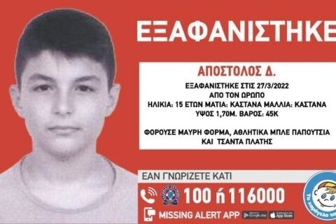 Για την εξαφάνιση του 15χρονου ενεργοποιήθηκε το missing alert Σε εξέλιξη βρίσκονται οι έρευνες για τον εντοπισμό...