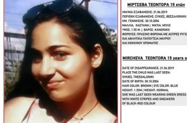 Την εξαφάνιση της 15χρονης Τεοντόρα Μίρτσεβα, από τις Συκιές, στη Θεσσαλονίκη, ανακοίνωσε το Χαμόγελο του Παιδιού....