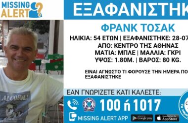 Στις 28 Ιουλίου 2023, εξαφανίστηκε από το κέντρο της Αθήνας ο Φρανκ (ον.) Τοσάκ (επ.), 54...