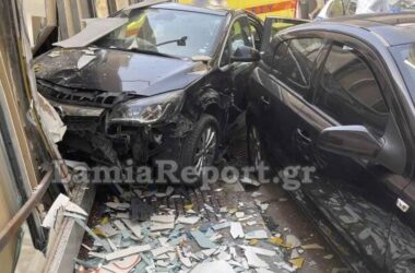 Λαμία: Απίστευτες εικόνες με αυτοκίνητο να «καρφώνεται» σε βιτρίνα μετά από τροχαίο