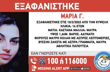 Στις 10.02.2022, στις 19.00μμ, εξαφανίστηκε από την περιοχή της Κυψέλης, η Μαρία Γ., 16 ετών, ελληνικής...