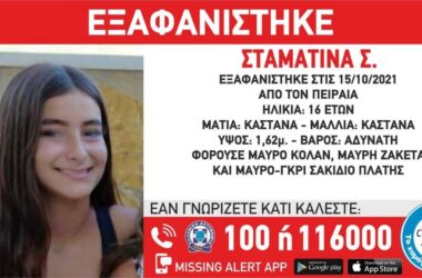 Εξαφανίστηκε από την περιοχή του Πειραιά την Παρασκευή (15.10.2021) η 16χρονη Σταματίνα Σ. και έχει σημάνει...