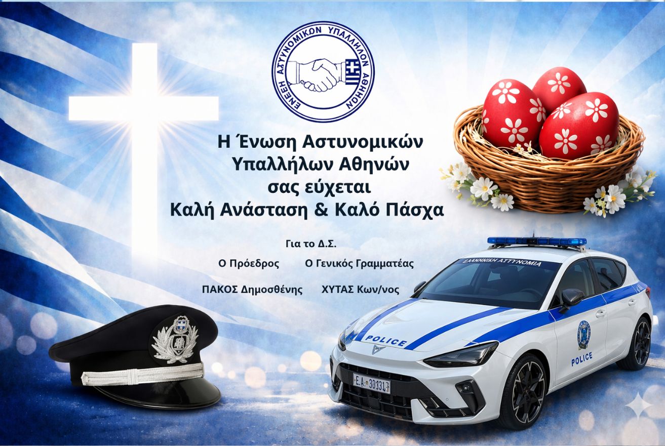 Με αφορμή τις Άγιες Ημέρες του Πάσχα, η Ένωση Αστυνομικών Υπαλλήλων Αθηνών απευθύνει θερμές ευχές προς όλους τους πολίτες, στέλνοντας ένα μήνυμα αισιοδοξίας, ενότητας και πίστης για το μέλλον.